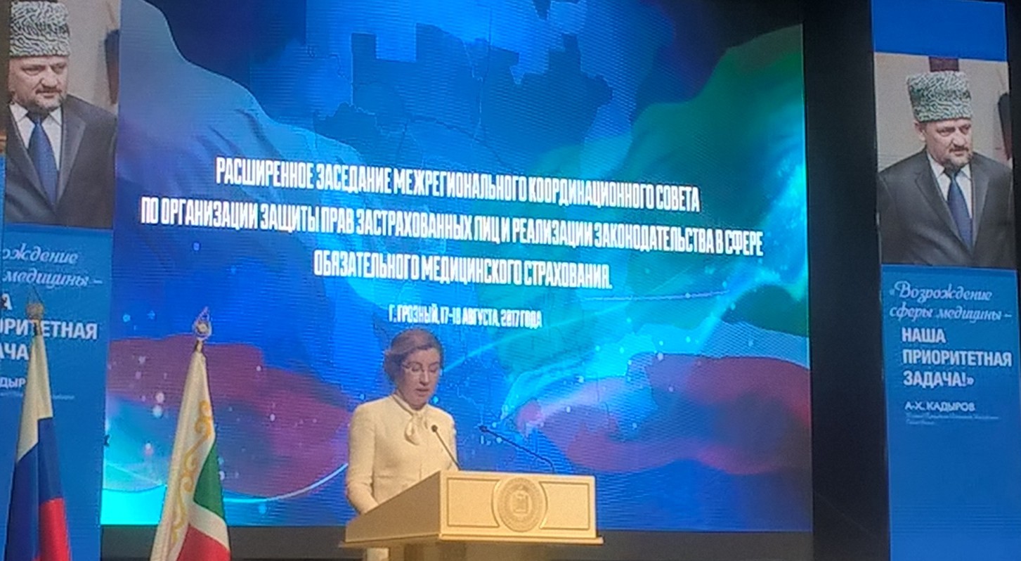 Расширенное заседание Межрегионального координационного совета 17 августа, Грозный 17-18 августа в г.Грозный (Чеченская Республика) состоялось расширенное заседание Межрегионального координационного совета по организации защиты прав застрахованных лиц при предоставлении медицинской помощи и реализации законодательства в сфере обязательного медицинского страхования. В мероприятии приняли участие председатель Федерального фонда обязательного медицинского страхования Н.Н.Стадченко, Кононова Л.П., первый заместитель председателя Комитета Совета Федерации по социальной политике, Мурашко М.А., руководитель Федеральной службы по надзору в сфере здравоохранения, директора территориальных фондов ОМС, представители федеральных законодательных и исполнительных органов власти, а также органов государственной власти субъектов Российской Федерации, главы крупнейших страховых медицинских организаций, представители научного и медицинского сообщества. Глава Чеченской Республики Р.Кадыров в приветственном слове рассказал об этапах становления сферы медицинского страхования на территории республики и наградил председателя Федерального фонда ОМС Наталью Стадченко медалью «За заслуги перед Чеченской Республикой».
