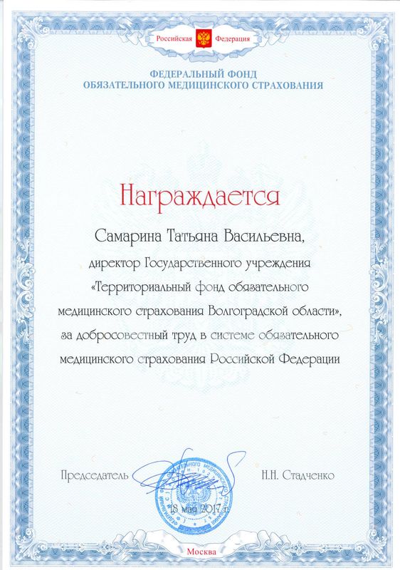 11.04.2013 г. Приказом Федерального фонда ОМС от 09.04.2013 №80 директор Государственного учреждения «Территориальный фонд обязательного медицинского страхования» Самарина Татьяна Васильевна назначена представителем Федерального фонда ОМС в Южном федеральном округе, а также включена в состав Совета директоров фондов обязательного медицинского страхования (Просмотреть документ Приказ ФФОМС №79 Просмотреть документ Приказ ФФОМС №80)
