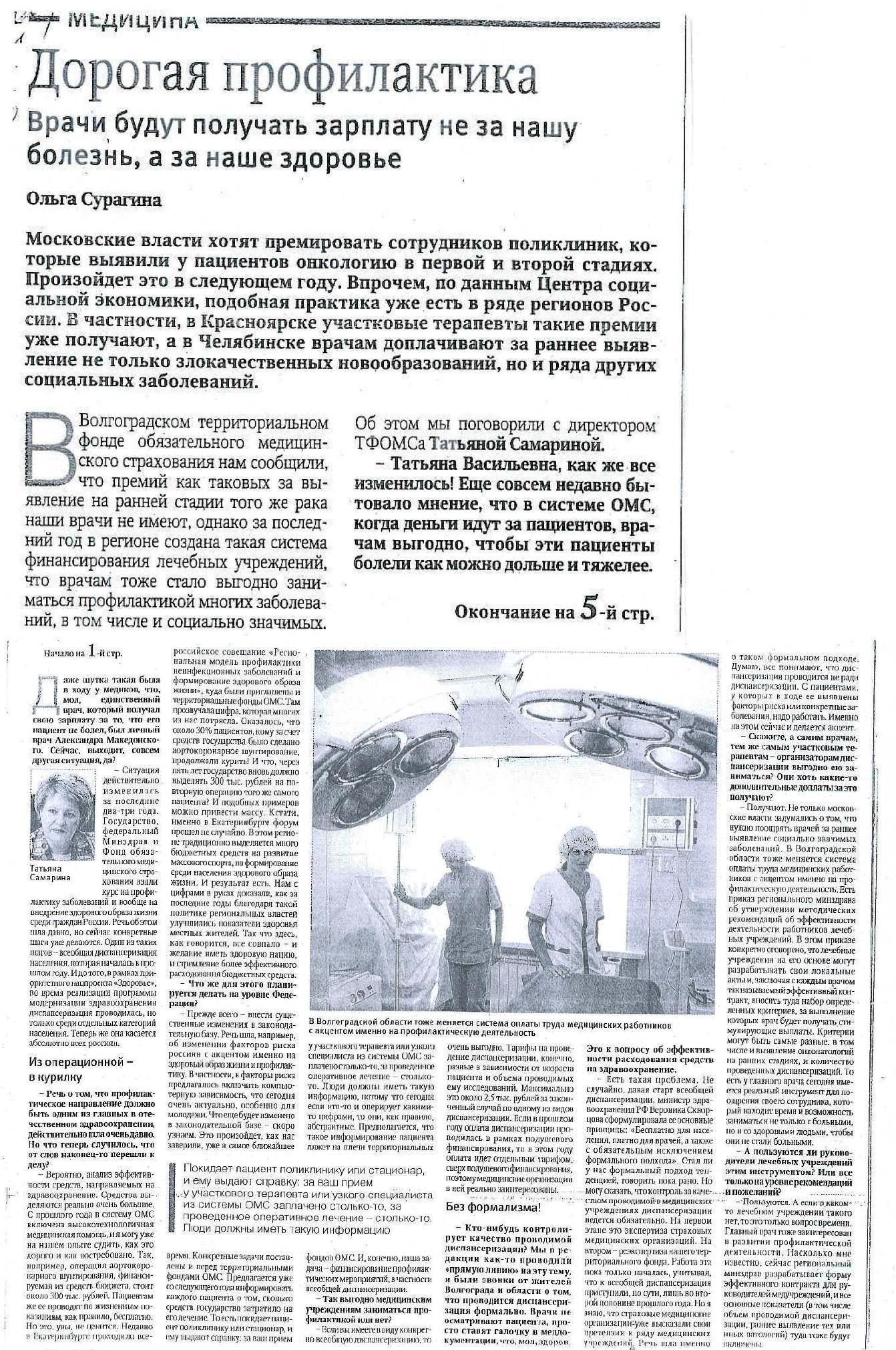 07.08.2014 г. Интервью директора "ТФОМС Волгоградской области" Т.В.Самариной в газете "Волгоградская правда" от 1 августа 2014 года "Дорогая профилактика"(Посмотреть статью)